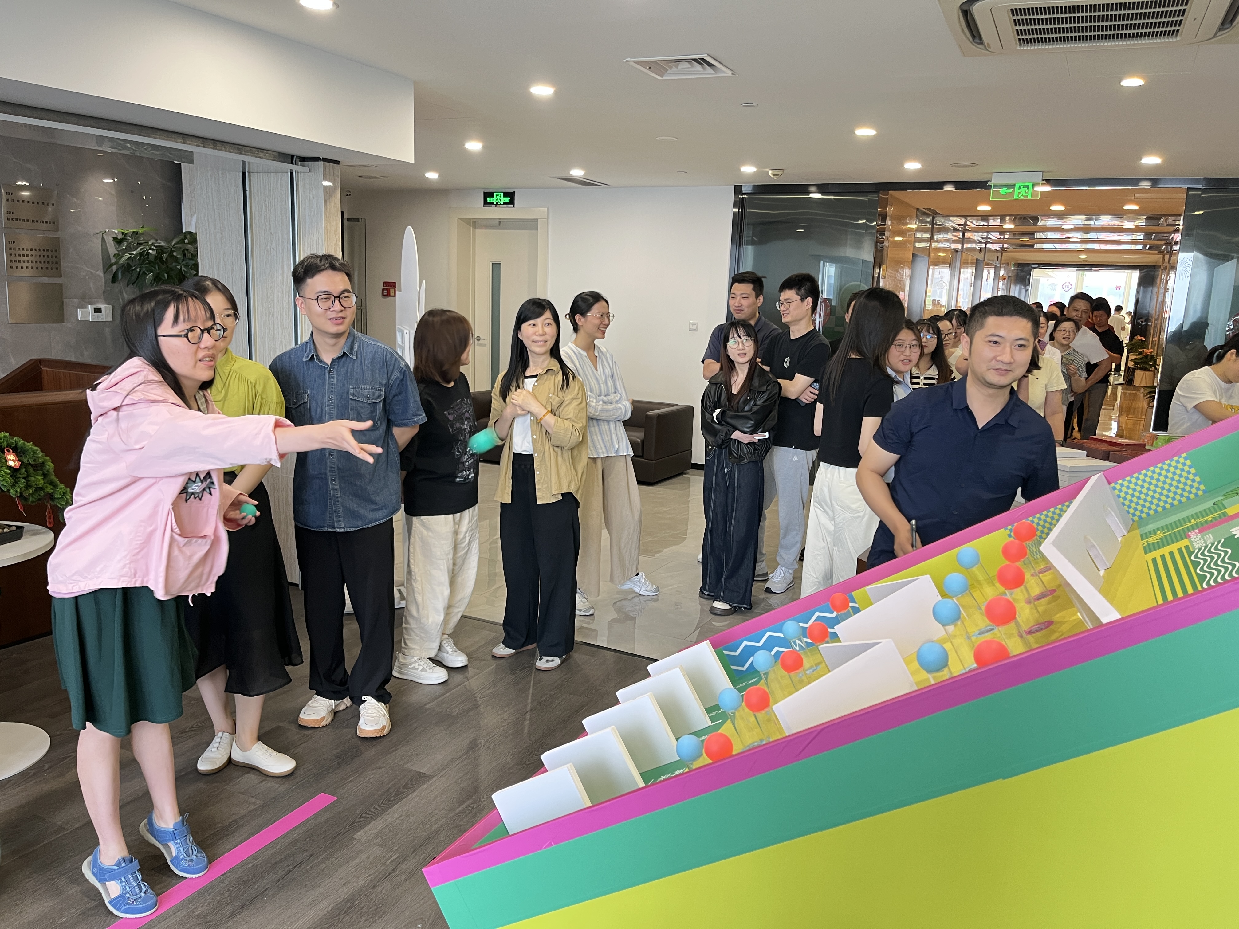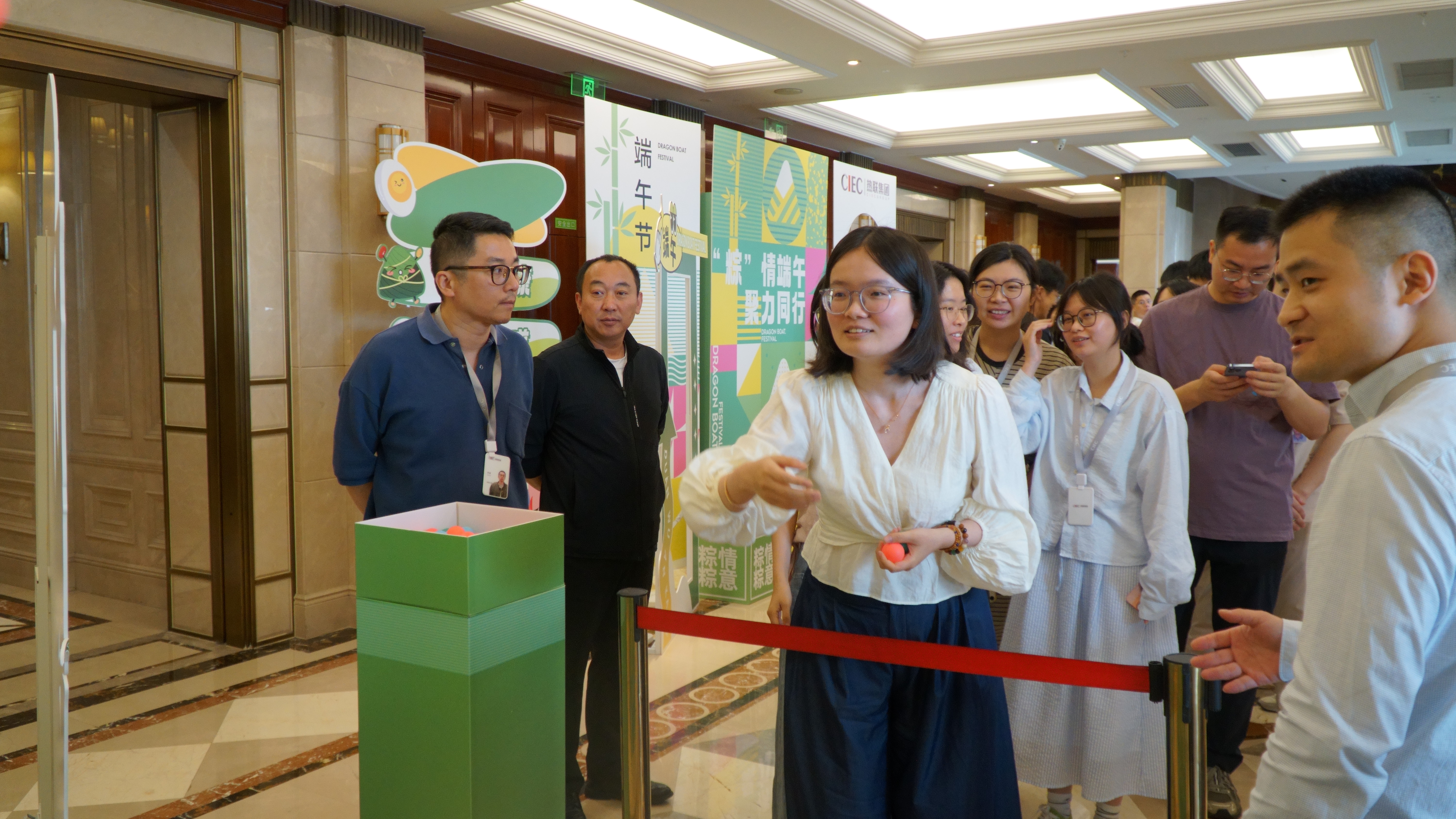 活动现场以端午元素精心布置,处处洋溢着浓郁的节日氛围。五彩斑斓的端午手链和造型精巧可爱的粽子形挂饰尤为吸睛,深受员工们喜爱。此次活动特别设置了会玩才出“粽”投球挑战游戏,参与者将小球滚落至下方奖区,即可赢取对应奖品。游戏规则简洁明了,却巧妙融合了技巧、运气与趣味性,吸引了众多员工踊跃参与,现场迅速排起了长队,气氛热烈。大家围聚在游戏区旁,为参与的同事加油喝彩,不时交流着自己总结的投掷 “秘籍”。当小球精准落入奖区时,现场响起阵阵欢呼声;即便未能获奖,参与者也在一次次尝试中尽情享受游戏带来的乐趣,端午节的温馨与快乐在此刻交融升温。